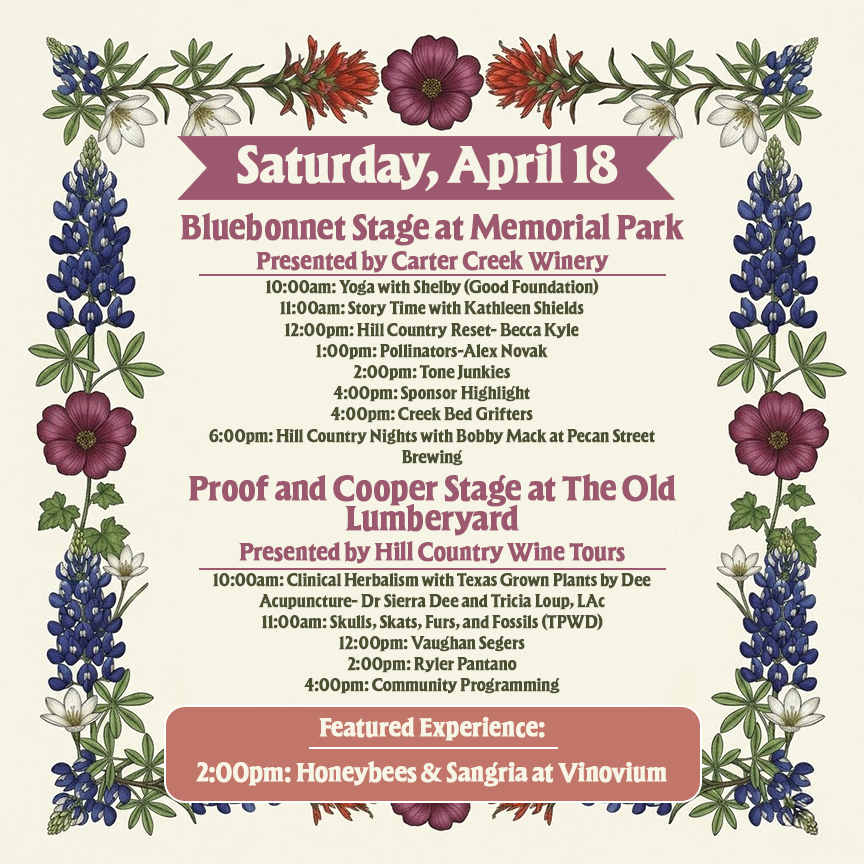A tasting-style presentation on how bees, vineyards and Texas wildflower work together to support healthy land and beautiful blooms