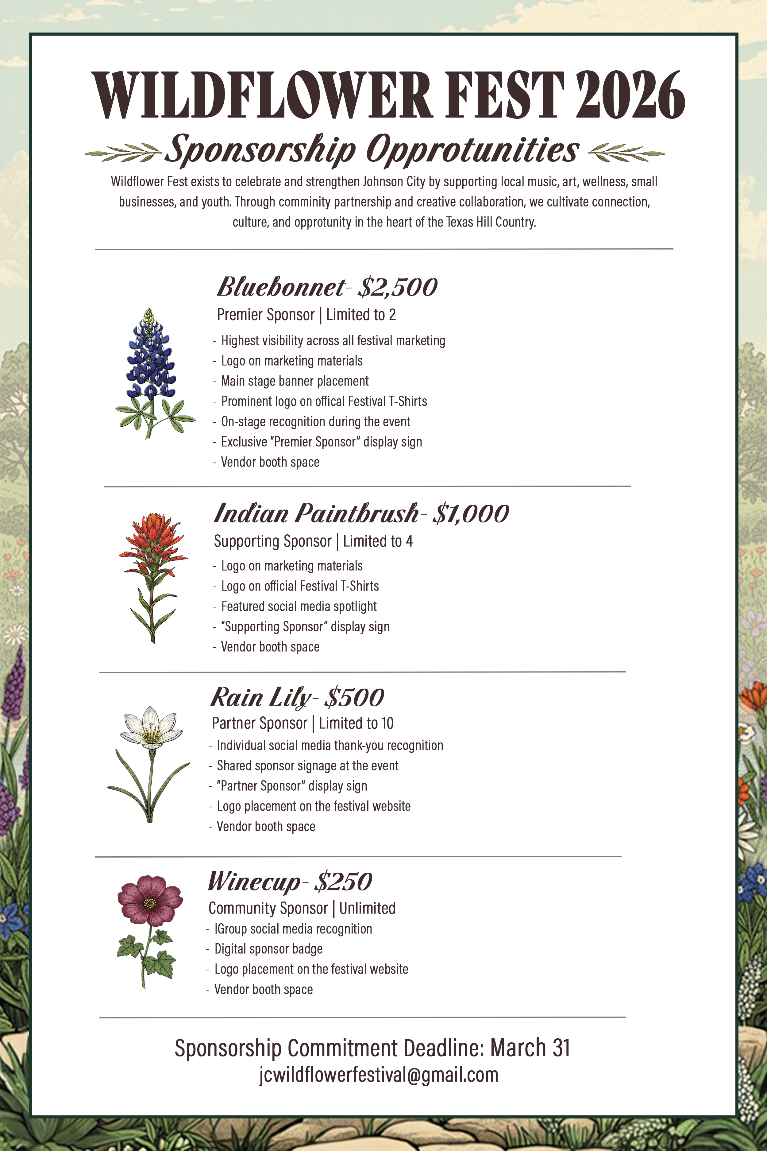 Support the growth of the Johnson City Wildflower Festival, a spring tradition rooted in community, creativity, and the Texas Hill Country.